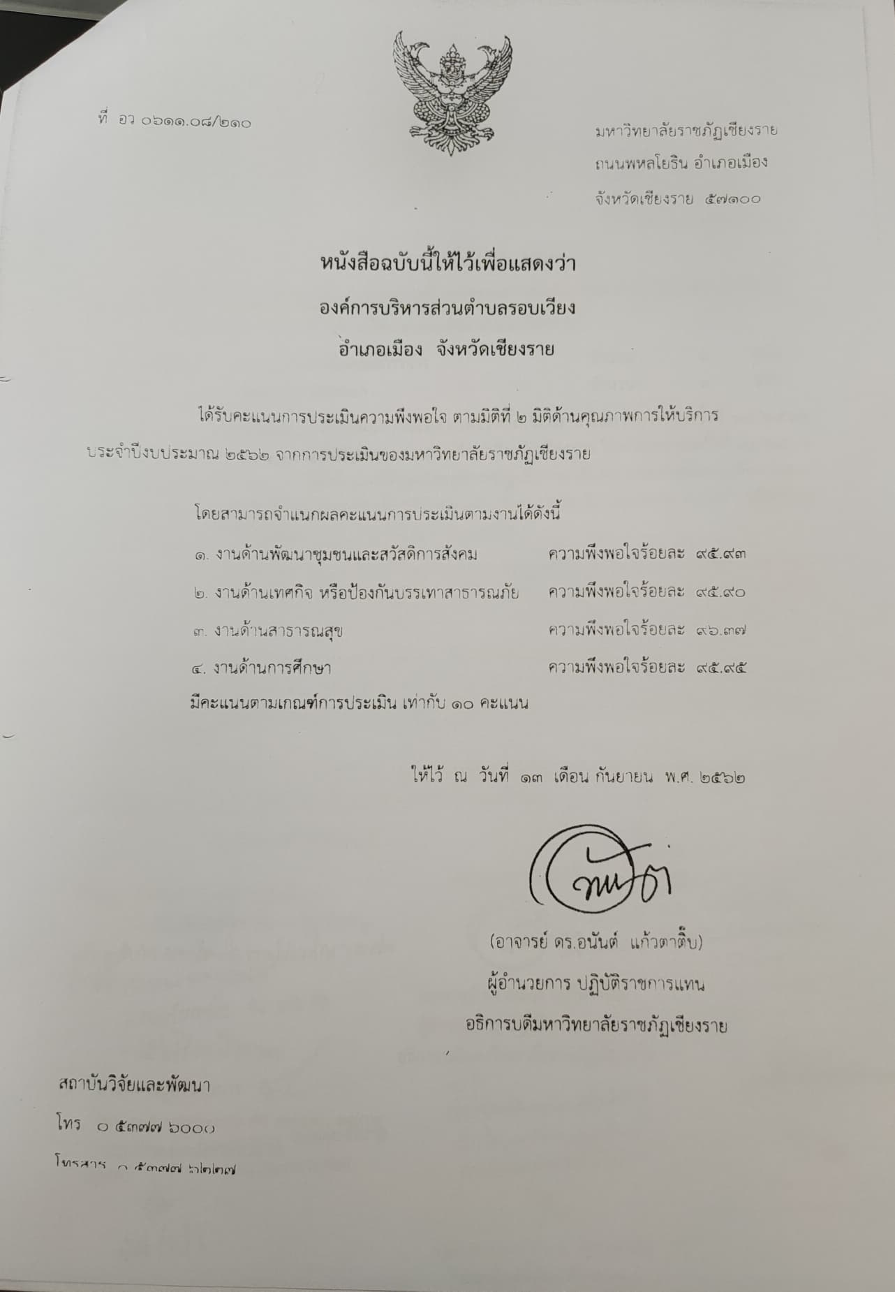 ผลการประเมินความพึงพอใจผู้รับบริการ อบต.รอบเวียง ประจำปี 2562