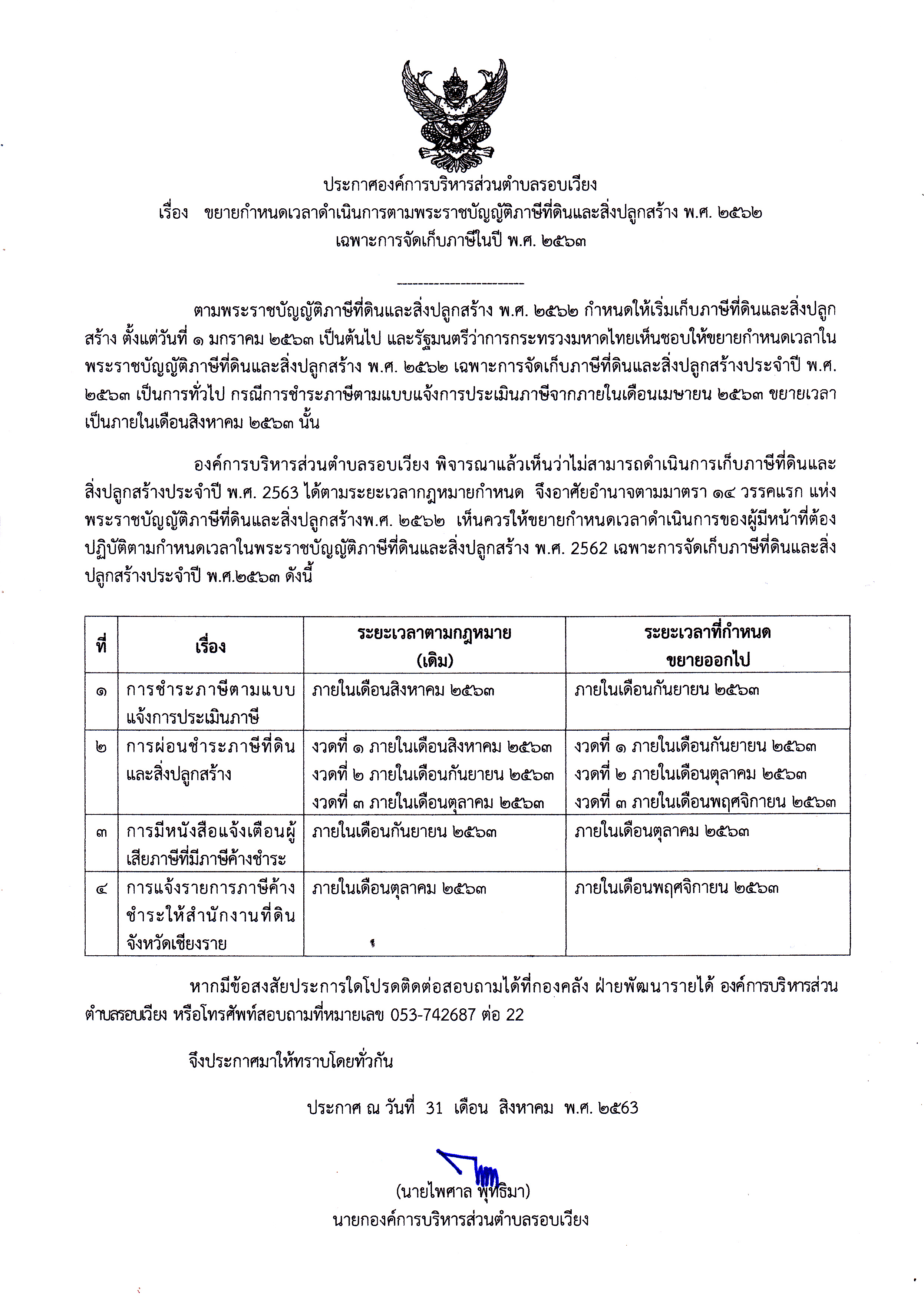 ประกาศองค์การบริหารส่วนตำบลรอบเวียง เรื่อง ขยายกำหนดเวลาดำเนินการตามพระราชบัญญัติภาษีที่ดินและสิ่ง